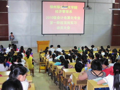 2011年5月9日,经济管理系在博闻楼110教室召开2010级会计电算化专业第一阶段顶岗实习动员大会,该系党总支书记高勇军、主管实习实训副主任黎渝林、学生科科长王静、会计教学团队教师和辅导员参加了动员大会,大会由黎渝林副主任主持。