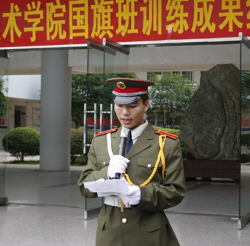我院国旗班于2010年11月组建成立,是受学院党委委托,由学生工作处直接领导,院团委、武装部具体指导的一个学生组织。国旗班成立至今,现有成员19人,他们都是从学院各系班级的优秀学生干部及入党积极分子中挑选出来的。学院国旗班肩负着每日升降国旗、校内重大活动升降旗及进行校园爱国主义宣传的任务。