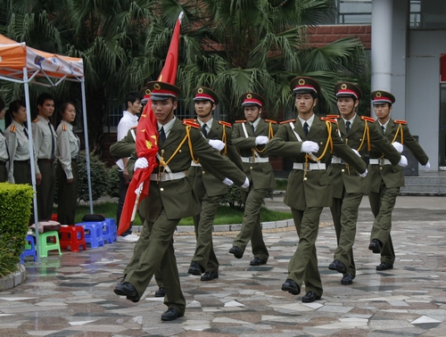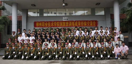 2011年6月26日上午,我院国旗班成功举行了主题为“述国旗情怀,谈奋斗心路”的国旗班队员训练成果展示及经验交流会。此次活动,得到市内各高校的支持,共有广西工学院、广西工学院鹿山学院、柳州铁道职业技术学院、柳州师范高等专科学校等7所高校派代表前来参加,共同切磋交流。