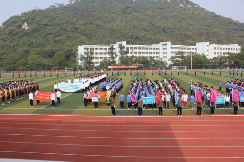 伴随着《运动员进行曲》激昂的旋律,系旗和系徽方队、彩旗方块队、裁判员方块队、篮球方块队、接力赛方块队、体操表演方块队和各专业学生代表方块队等排着整齐的方阵,迈着坚毅的步伐昂首步入会场,响亮的口号声、观众席上的欢呼声彰显了大学生昂扬的斗志与青春的风采;紧接着彩旗方块队由紧密的方阵分成两路迅速散开,并一字站开,组成一个面向主席台的“凹”字形,将站在中央的运动员环抱起来,整个过程井然有序,运动场上彩旗飘飘;随后,全体师生面向国旗行注目礼,奏国歌。