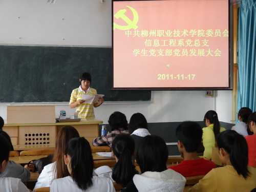 2011年11月17日,信息工程系党总支学生党支部在文华楼103教室召开了学生党员发展大会。会议由学生党支部书记龙思珍主持。