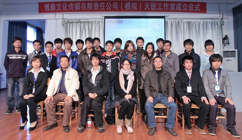2011年12月9日下午,博雅文化传媒有限责任公司(模拟)天锐工作室在德馨楼301举行成立仪式,党委宣传部部长左妮红,党委宣传部、现代教育技术中心的相关指导老师及各社团代表参加了成立仪式。