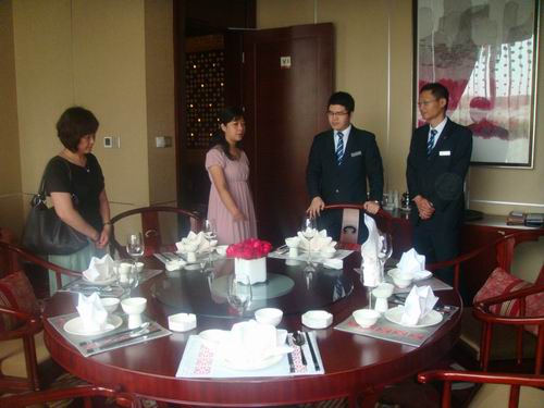 调研过程中,柳州丽笙酒店人力资源部总监陆明先生首先对该系调研组的到来表示欢迎,丽笙酒店人力资源部总为调研组介绍了酒店各方面情况。然后带领老师们分别到部宴会厅、西餐厅、豪华中餐厅等地进行实地调研,并着重带领调研组老师观看了酒店中餐主题宴会设计情况,酒店还为调研组老师们展示了中餐主题宴会摆台。最后酒店陆明总监还与调老师就酒店人才需求、校企合作、学生顶岗实习与就业的问题进行了较为深入的交流、探讨。