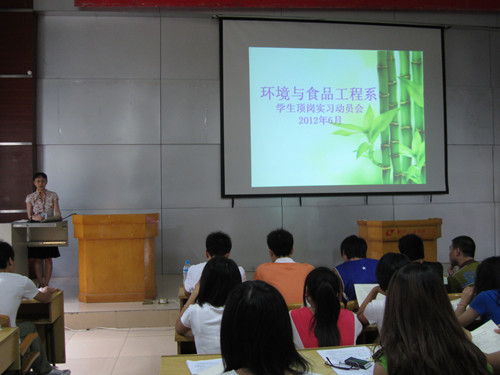 2012年6月28日上午,环境与食品工程系在博闻楼110教室召开学生顶岗实习动员大会。该系党总支书记、主任汪少冲,副主任黄宁,学生党支部书记陈富贵和分团委书记黄姿梅老师以及2010级、2011级全体学生参加了此次动员大会,大会由黄姿梅老师主持。