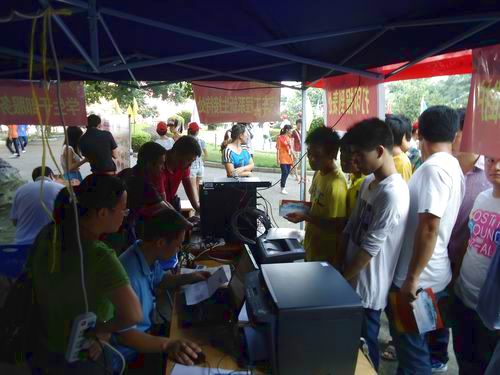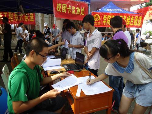 同时系部还设立3个接待点(处)、1个大本营,各接待点与咨询处均有学生干部和志愿者轮岗值班,学院本部B区校门口咨询处的同学负责将来到的新生引导至“大本营”,睿智园、明德园两处接待点主要负责将办理完注册手续的新生引导至宿舍安顿。