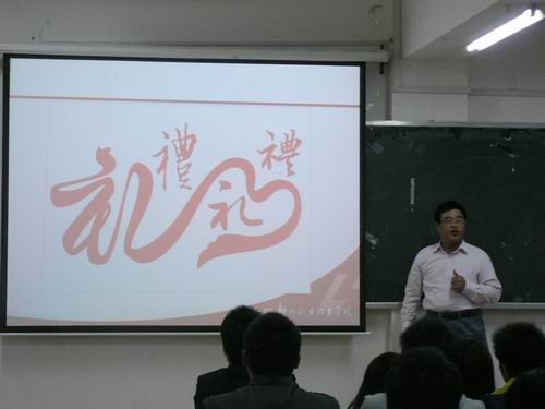 2012年11月16日下午,素质教育基地“博雅?六艺”讲坛在博闻楼312教室举办了一场关于“礼与德”的讲座,主讲人为广西社会心理学会副会长、我院公共基础部(思政部、素质教育基地)主任姜献生教授,来自各系的近150名学生聆听了讲座。