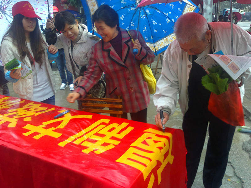 早上8点多,冒着寒冷的雨点,志愿者们来到双龙苑社区,给过往的市民发预防艾滋病的宣传单和小礼物,并让他们在横幅上签字。在活动现场还专设了一个小小的医务站,由特约医生为市民测血压、做体检。