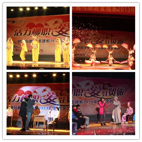 2013年1月4日晚,冷雨霏霏、寒风刺骨,我院艺术校区大礼堂灯光璀璨、温暖如春。贸易与旅游管理系2013年“活力柳职、爱驻贸旅”新年文艺晚会在此举行。寒冷的的天气阻挡不了贸易与旅游管理系全体师生的热情,大礼堂座无虚席,学院学生工作处处长唐冬雷、副处长景凌凌,贸易与旅游管理系党总支书记牛永惠、主任何志忠、副主任谭欣、林志红,学院团委老师以及该系老师等出席了晚会,晚会共持续了两个多小时,节目精彩纷呈,现场观众热情高涨。
