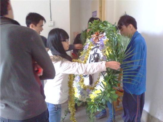 在筹备活动的准备期间,来自院团委志愿者工作部和国旗班的同学们非常用心,他们用纸折成花型围绕框架做成了一个花圈,并亲手写上了挽联,通过亲手制作花圈加深了同学们对此次活动认识,也真实真切的表达了对烈士的缅怀之情。
