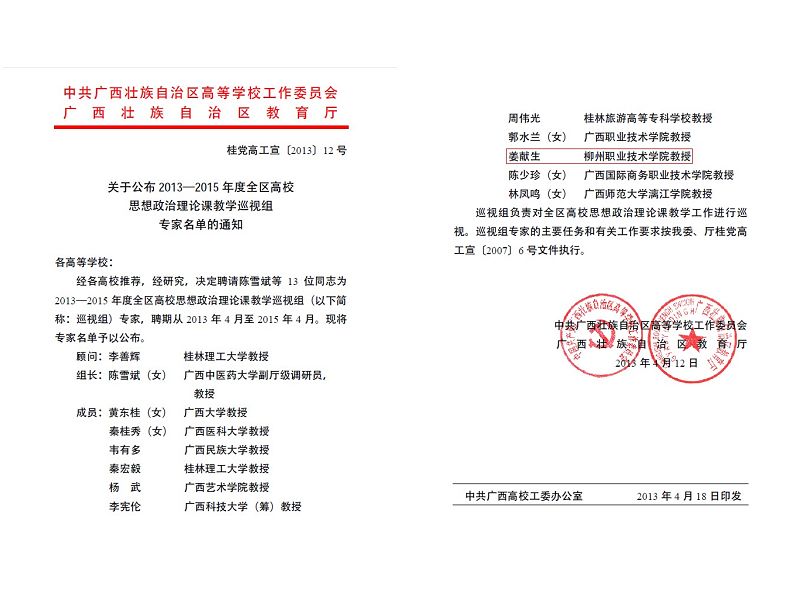 近日,广西高校工作委员会、教育厅下发了《关于公布2013-2015年度全区高校思想政治理论课教学巡视组专家名单的通知》【桂党高工宣(2013)12号】,我院公共基础部(思政部、素质教育基地)主任姜献生教授被聘为2013-2015年度全区高校思想政治理论课教学巡视组专家。
