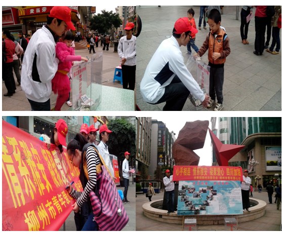 20日晚21时,院团委组织机电工程系分团委20余名学生积极报名参加团柳州市委、柳州青年爱心社团于21日开展的市募捐活动;4月21日在市中心步行街举办的为雅安灾区募捐活动现场,前来捐款的柳州市民热情高涨,许多家长都带着自己的孩子前来捐款,我们的志愿者在现场也目睹了一幕幕的感动,他们自觉向每一位捐赠者鞠躬表示感谢,活动最后这20名志愿者除了自行参与捐款之外,还将团市委发放的就餐补贴也全额捐出,活动结束时,一位来自我院四川籍的志愿者学生激动地说:“听到团市委赵涛涛书记说今天这笔捐款将于22日就发往雅安市团市委,真是非常感激,一方有难八方支援,谢谢柳州市民!”