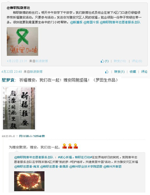 据了解,在此次四川地震发生后,我院部分学生会、学生社团、学生团体都在各自官方微博上自觉发起网络祈?;疃?,部分学生团体除了自发发起祝福、祈?;疃狗追鬃⒐诟髅教宓脑智榧熬仍ǖ?,越来越多的同学陆续参与到了网络互动中。