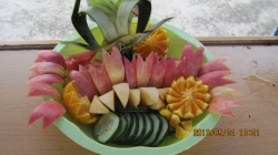 各组参赛选手根据自己所选的水果进行构思、雕刻和拼接,用最小的水果成本,发挥各自独特的想象力,同时协调团队合作能力,在时间、空间的限制条件下,创作出一盘盘生动、特色的佳作。各组代表对作品进行解说时,有的与“中国梦”联系起来,有的与神话传说联系起来,有的与梦和感恩联系在一起,有的与同学们之间的友谊紧密联系,都得到了评委的一致好评。此次比赛在该系同学们及各系部代表的积极配合下得以成功举办。