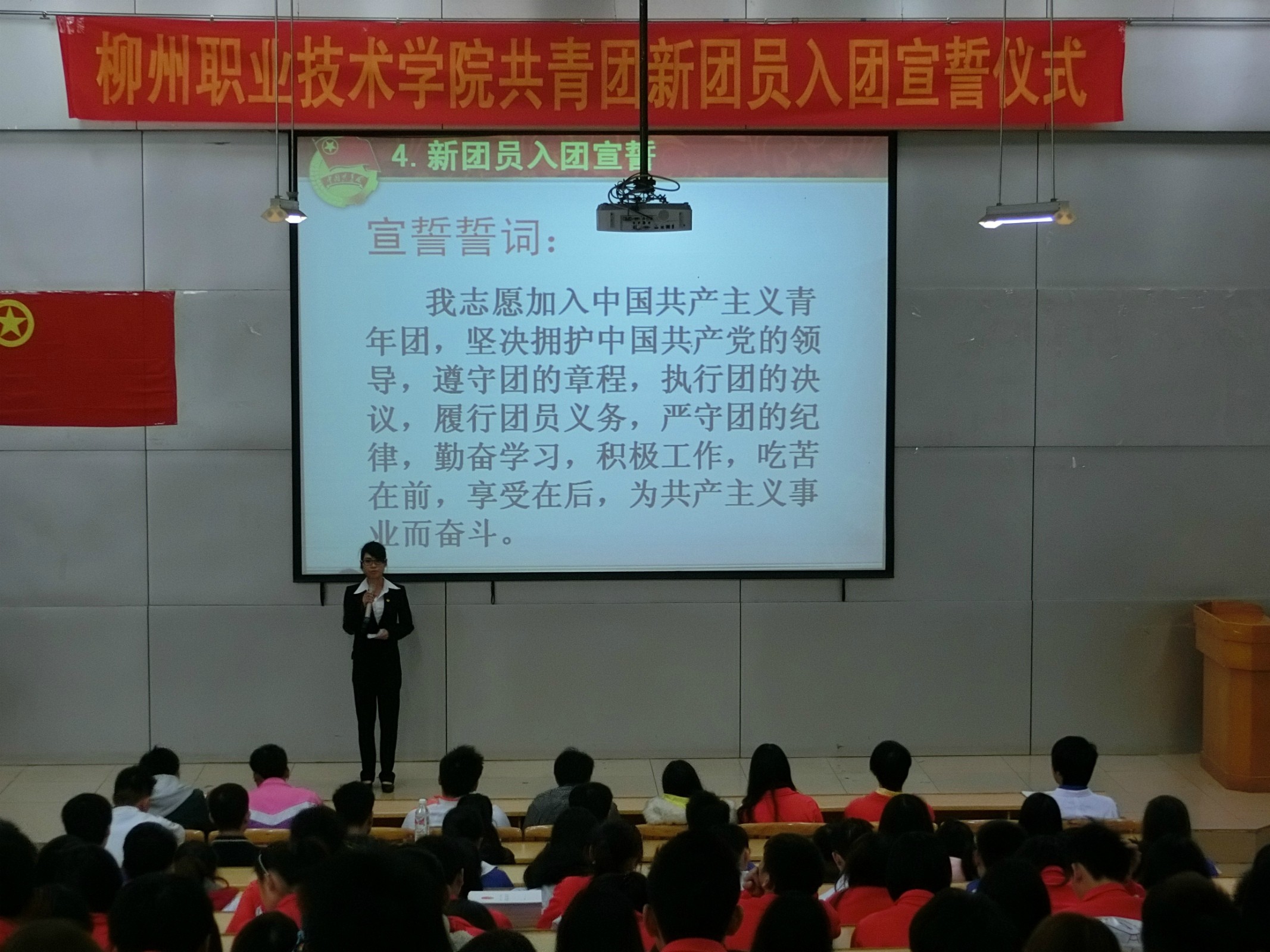 致词之后,院学生会干事黄敬平同学带领新团员做入团宣誓,新团员们面对着鲜红的团旗、团徽庄严的举起右手,整齐而洪亮的读着入团誓词,雄壮的宣誓声在会场里久久回荡。
