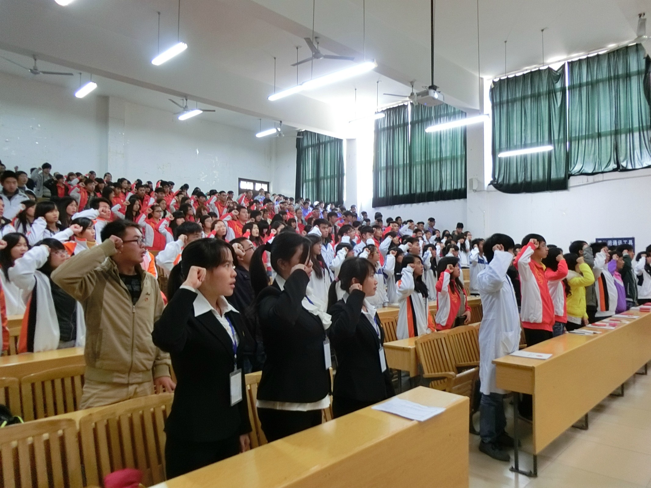 2013年12月13日12点30分,我院247名新团员入团宣誓仪式在博闻楼110室举行。出席本次宣誓仪式的有院团委办公室主任杨小浒老师,院学生会主席团成员及各系部学生会代表等。该仪式由院学生会组织部部长马婷婷主持。