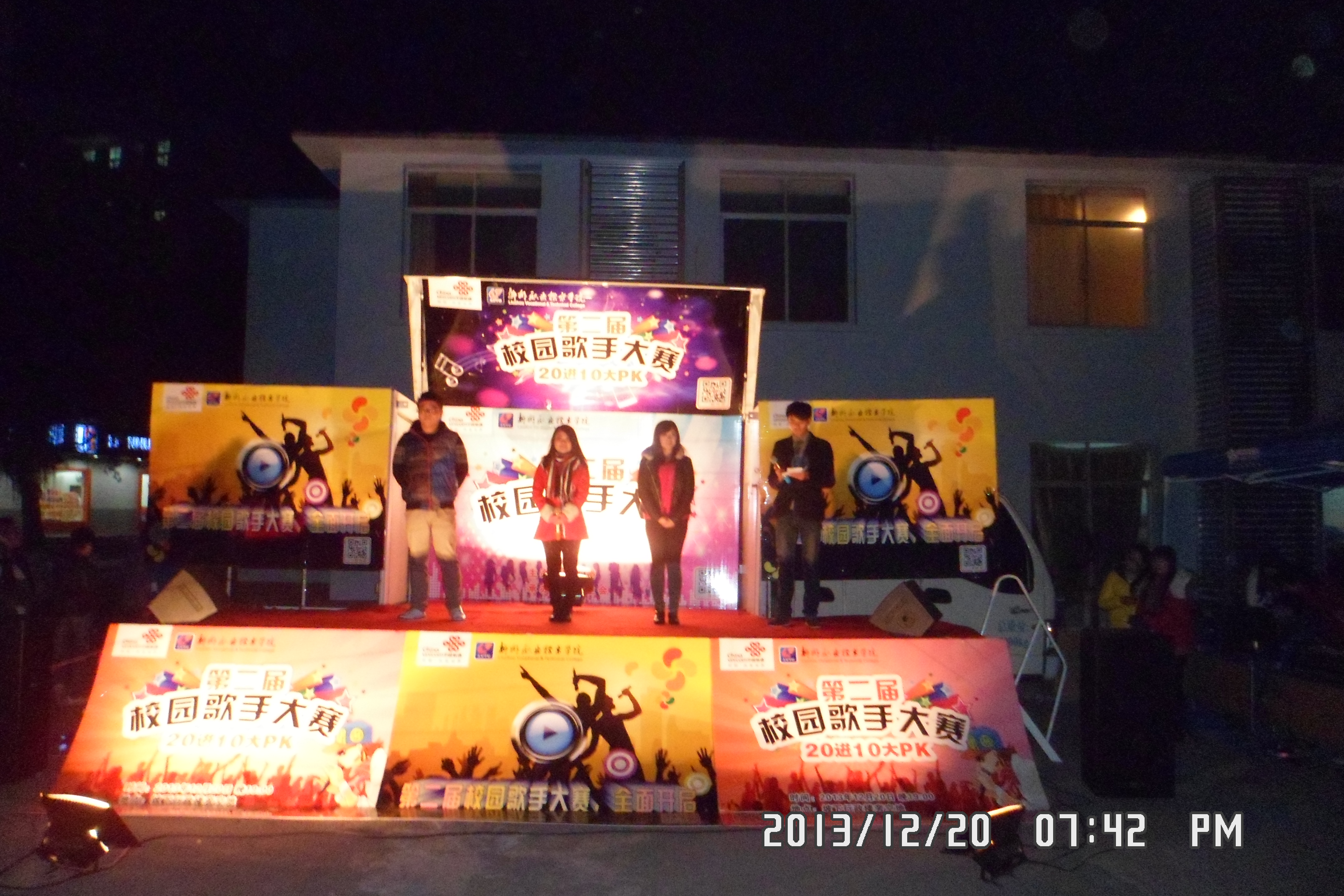 2013年12月20日晚19:00,由院团委主办、院学生会承办的学院第二届“校园十佳歌手”大赛“20进10”比赛在坡下A区举行。来自各系初赛、复赛决胜出的20名选手在此一绝高低,抢占本届十佳歌手10强宝座。院团委王慧书记、杨小浒老师到场观看了活动。