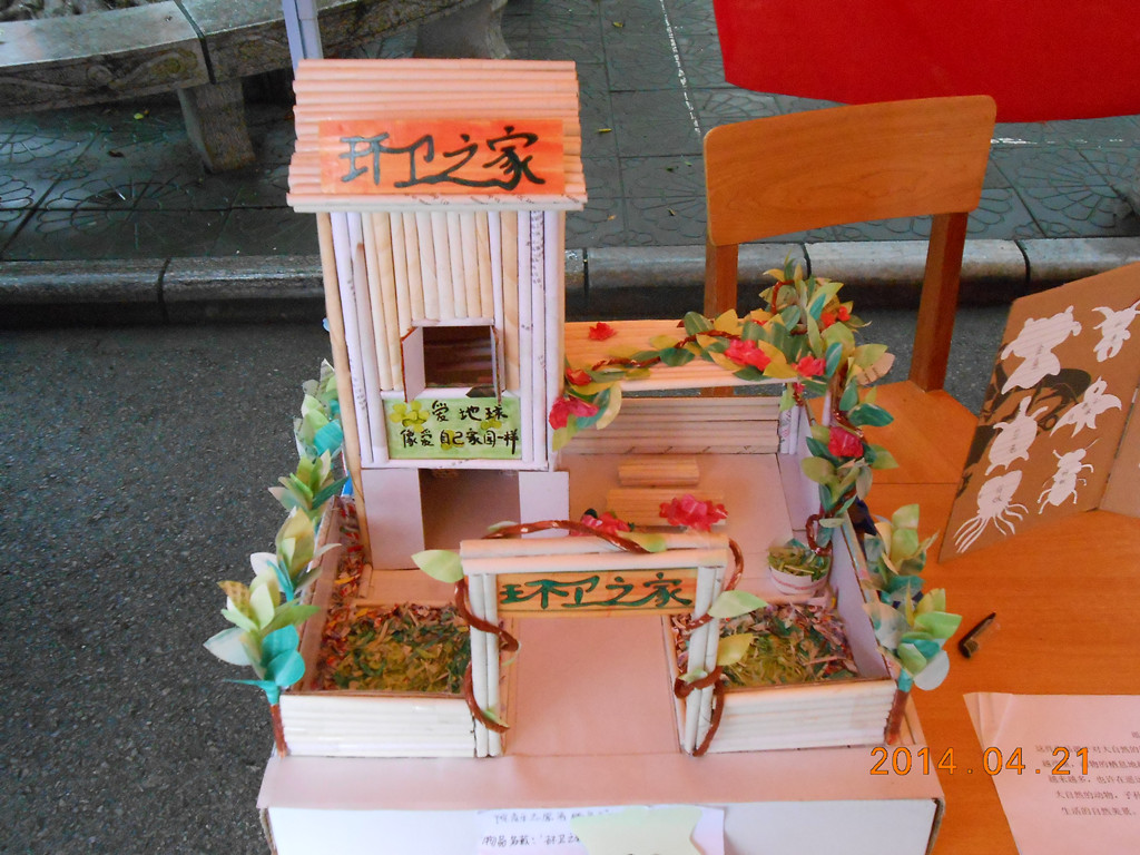 评比前,40多件参赛作品于21日在学院本部A区进行了展示。22日,由全院同学票选出“环卫之家”、“理念柳职”、“坦克”等十件优秀作品进入评比。这些参赛的作品均为同学们纯手工制作,制作材料主要是废弃的一次性筷子、易拉罐、废纸等,突出了今年地球日的主题:珍惜地球资源,倡导低碳生活。