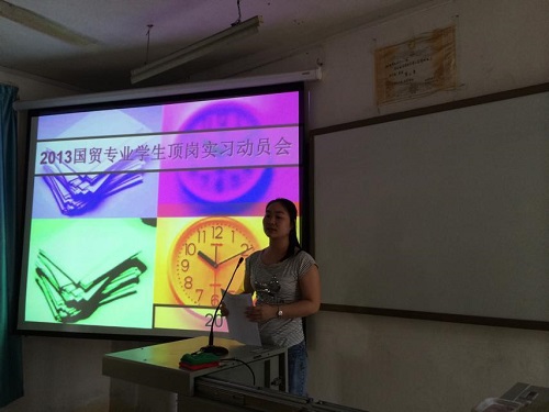 2014年6月21日下午3时,贸易与旅游管理系召开2013级国际经济与贸易班赴广州、深圳实习动员大会,该系书记牛永惠、副主任林志红、学生科科长陈月明、团队负责人王婷、辅导员吴鹏出席会议。