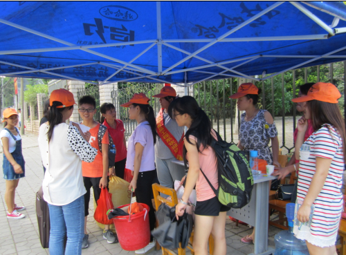 又到一年迎新时,与大本营热火朝天的景象不同,在宿舍区15号楼门前,静静地撑起了一把小伞,这是环境与食品工程系设立的关怀新生服务岗。几位统一戴着橘色帽子和佩戴笑脸徽章的志愿者站在伞下,静候该系学妹学弟们的到来。