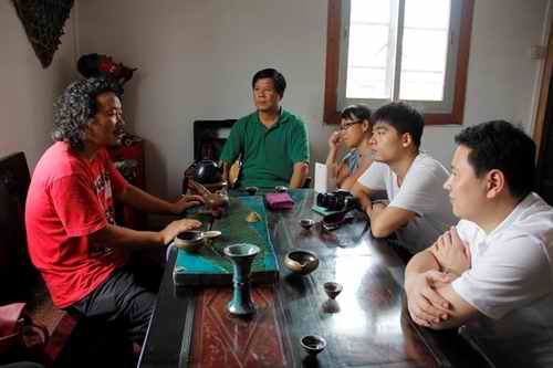 向广东省工艺美术大师杨英才(左)请教