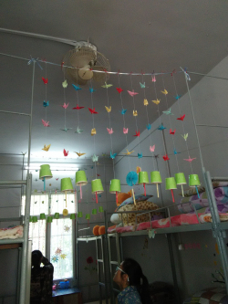 11月28日下午,比赛开始。只见各宿舍的床铺整洁,地板干净,明亮舒适,给人带来精神上的愉悦。各宿舍的同学们都积极贡献自己的创意,充分利用废弃物品装饰自己的宿舍。例如,把废弃的一次性水杯、瓶子别出心裁地打扮成漂亮的风铃等手工艺品;用报纸卷成直筒,粘贴在纸板上做成杂物柜;还有用宣传纸折叠成小纸花、用鸡蛋壳养花等奇妙的招数扮靓宿舍。各宿舍按照各自的特色,都起了一个别具一格的名字——“简朴寨”“闺蜜之家”“乌托邦”“温暖屋”“九宫阁”。最后,14#202、203等13间,6#103、106等8间,7#106、112、203等7间,共28间宿舍评为“优秀宿舍”。