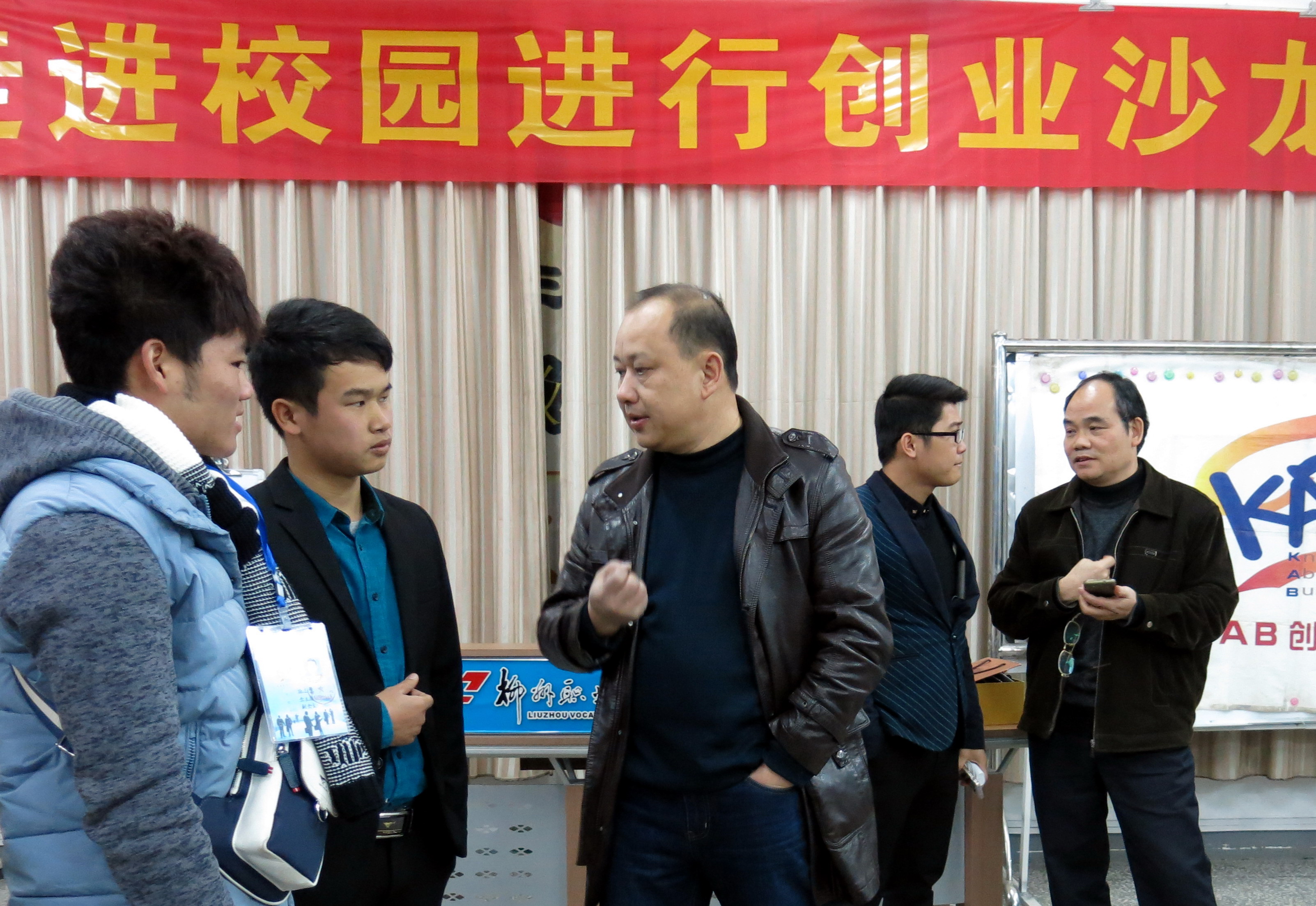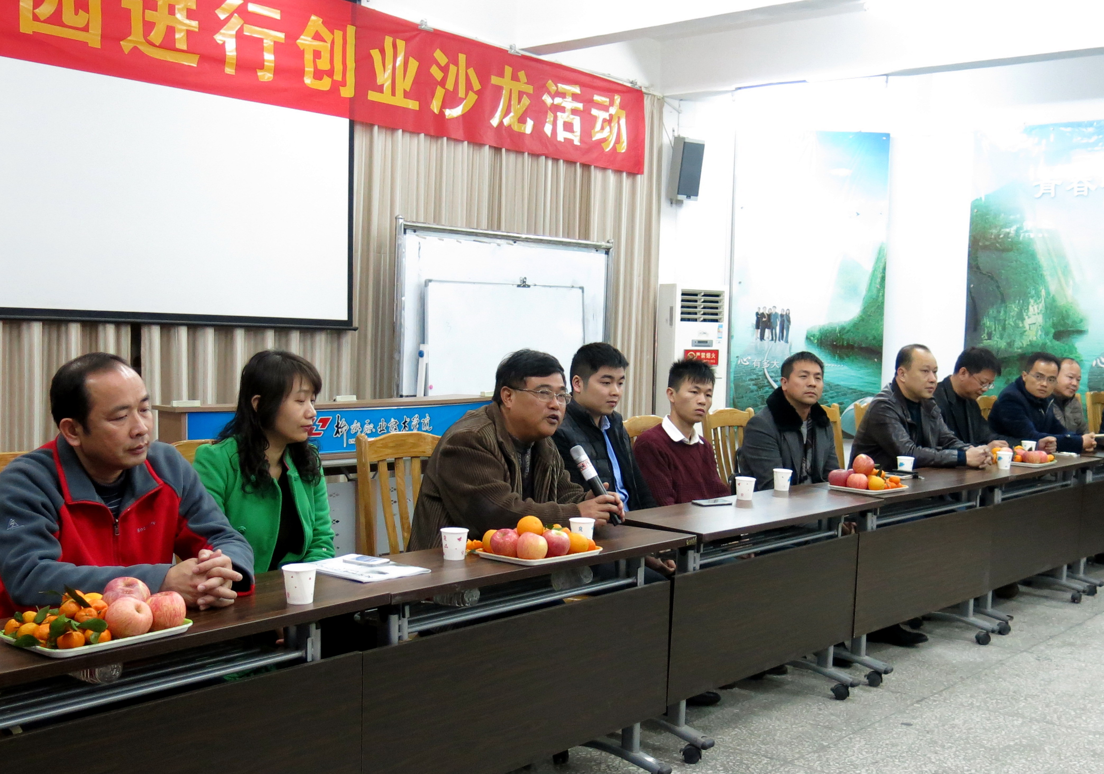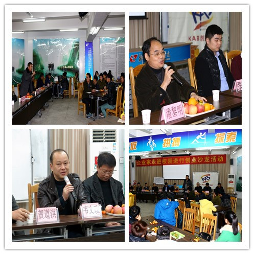 新闻网消息(通讯员 素质教育基地 许明)12月26日下午,由柳州团市委城市部和企业家协会、青年创业促进会主办,我院素质教育基地大学生KAB创业俱乐部承办的、柳州企业家走进校园创业沙龙活动,在素质教育基地就业与创业训练中心举行。柳州市电子商务促进会执行会长宣宏隆、绿果百货贸易公司总经理陈海泉、纳鑫物资有限公司董事长邱国贤、华硕管理咨询有限公司副经理潘黎明、贺尔德钢贸易有限公司总经理贺道洪、青年创业导师韦文正、张志、罗浩扬等嘉宾以及我院素质教育基地姜献生主任,陈芳、李革副主任和大学生kab创业俱乐部指导老师许明教授出席,学院大学生kab创业俱乐部理事会成员以及2014级会员共七十多名同学参加。