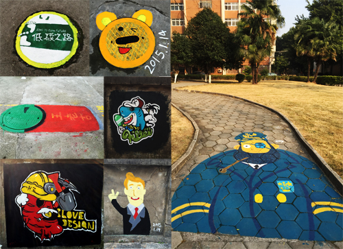 艺术校区是柳州职业技术学院较老的校区,每年迎接新生的时候都能听到学生们说:“这个校区好老,好像都没有艺术校区该有的氛围呢?”带着这样的问题,老师和学生们都在思索该如何改善。在该校区,虽然经?;嵊锌纬套髌氛估览捶岣恍T拔幕ㄉ瑁坏┏氛挂院?,便又回到老旧沉闷的状态。在这样的状态下,艺术设计系的学生们在老师的引导下集思广益,通过成立校园环境建设专题小组,对校园环境、文化、专业特点等进行深入分析,决定由2013级广告设计与制作班同学执笔,进行校园涂鸦活动。通过色彩丰富、内容积极的涂鸦图案来装饰校园。你看,那些原本不起眼的井盖,在学生们的笔下,变成王老吉瓶罐,变成维尼熊,甚至还教育人们要走环保之路……胖胖的独眼船长躺在小花园的斜坡上晒太阳;水塘的围栏更是因为有了彩色的卡通图案变得生动有趣,深受大家欢迎。
