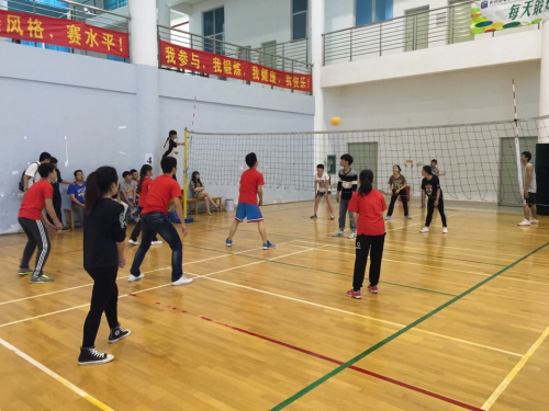 每天下午5点钟准时开赛,各班的拉拉队早已聚集在赛场周围翘首以待,队员们也做好了准备。随着一声哨响,气排球在网栏两边来来往往,各班的队员们龙争虎斗、各施展绝技,一个个精彩的拦网、扣球,各班的队员们也完成了一个又一个完美的配合,各队比分在裁判员的一次次翻牌中交替上升,在场的观众欢呼不已。落后的队伍也毫不逊色,不断调整自己的战略战术,为了扳回比分发扬了永不放弃的精神。此时,场下的拉拉队也喊破了喉咙,为自己支持的队伍加油助威,场下也是蛮拼的。