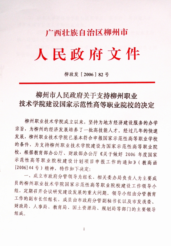 柳州市政府发文支持我院建设成为国家示范性高等职业院校 来源:网络 作者:不详 编审: 发布时间:2010-03-18 浏览次数: 次 【字体:小 大】 分享到: 2007年1月,柳州市政府发文支持我院建设成为国家示范性高等职业院校. 关闭 打印正文