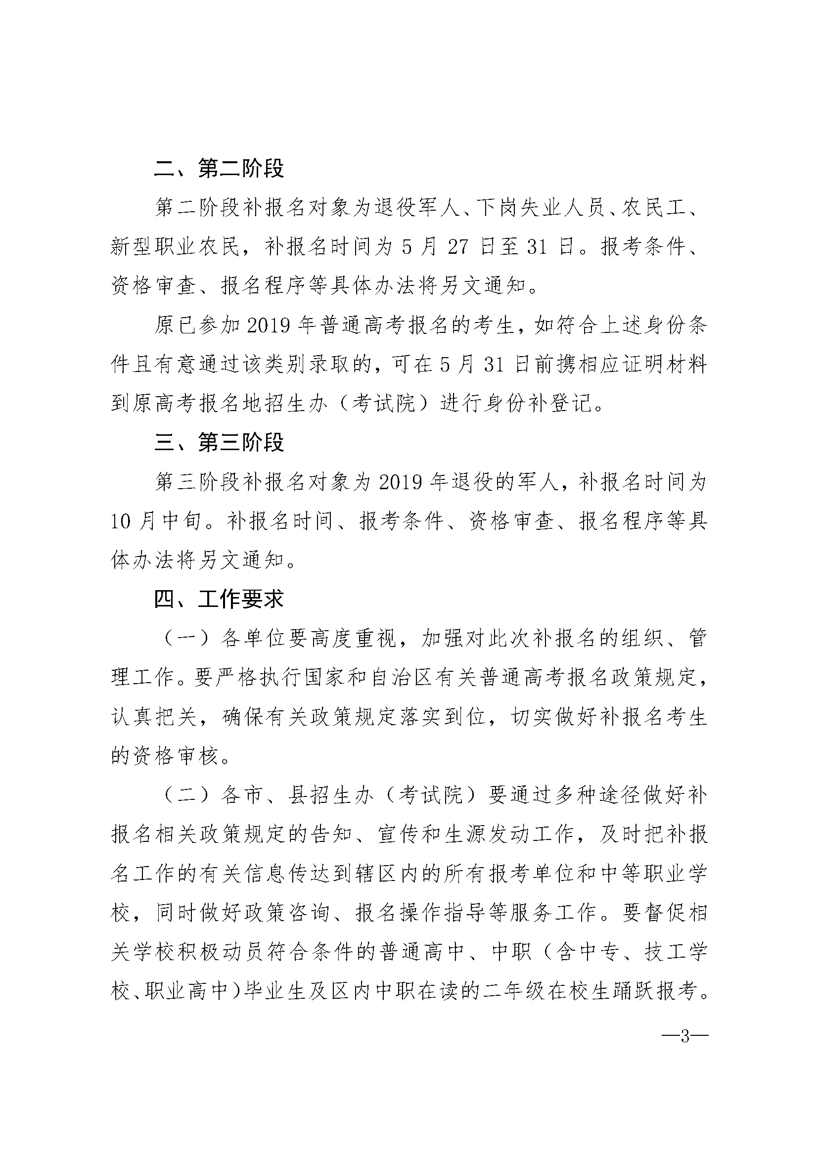 转发(桂招考委〔2019〕2号)关于做好我区2019年普通高等学校招生考试补报名工作的通知 来源: 发布时间:2019-05-08 18:43:00 浏览次数: 次 【字体:小 大】 正文公文,可使用电脑访问浏览或下载文件浏览(桂招考委〔2019〕2号)关于做好我区2019年普通高等学校招生考试补报名工作的通知.pdf 终审:招生信息中心 分享到: 【打印正文】