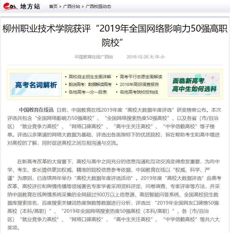 新闻网消息(文/招生处 陆露 图/招生处 黄莉)2020年1月5日,我校从中国教育在线网站获悉,中国教育在线2019年度“高校大数据年度评选”获奖榜单公布。我?;衿乐泄逃谙摺?/span>2019年全国网络影响力50强高职院?!?。
