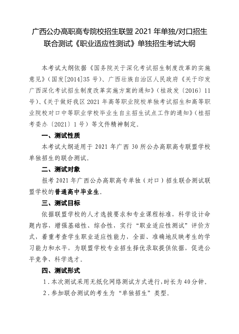 广西公办高职高专院校招生联盟2021年单独考试招生联合测试考试大纲及样题 来源:广西公办高职高专院校招生联盟 发布时间:2021-03-04 17:46:46 浏览次数: 次 【字体:小 大】 终审:招生信息中心 分享到: 【打印正文】