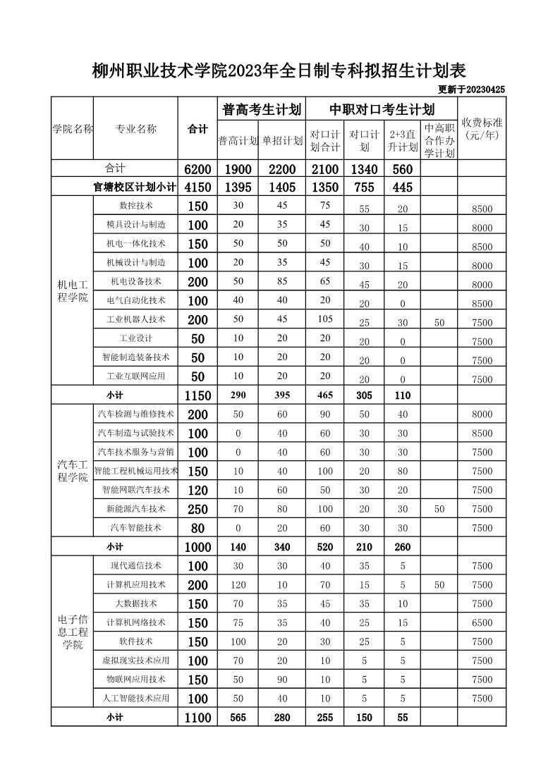 2023年柳州职业技术学院全日制普通高校拟招生计划表【发布于20230425】