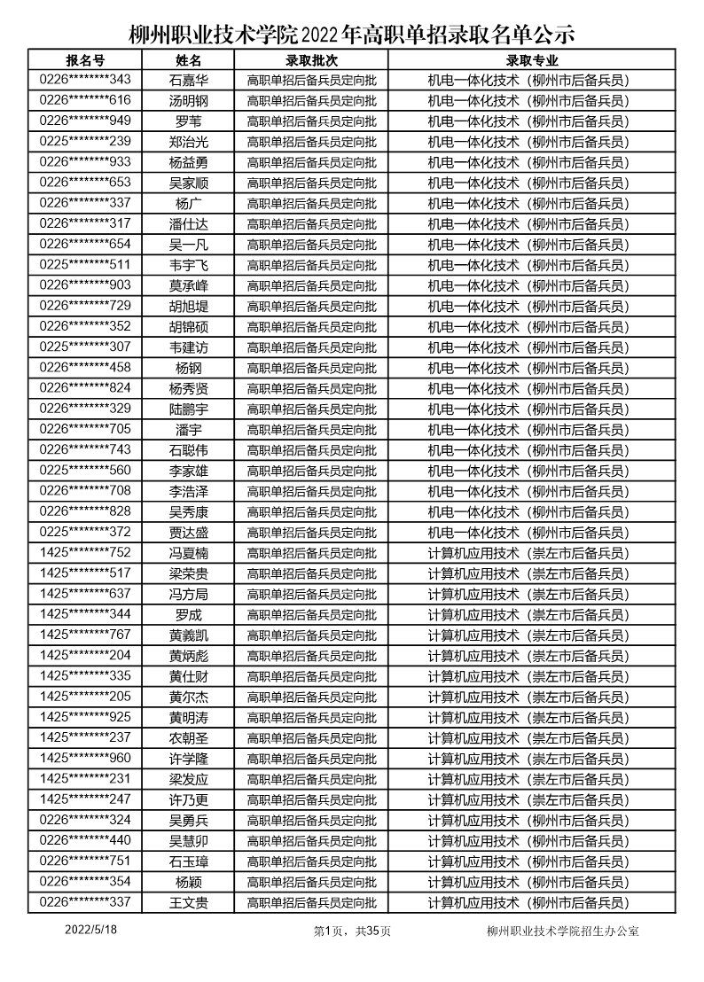 柳州职业技术学院2022年高职单招录取名单公示