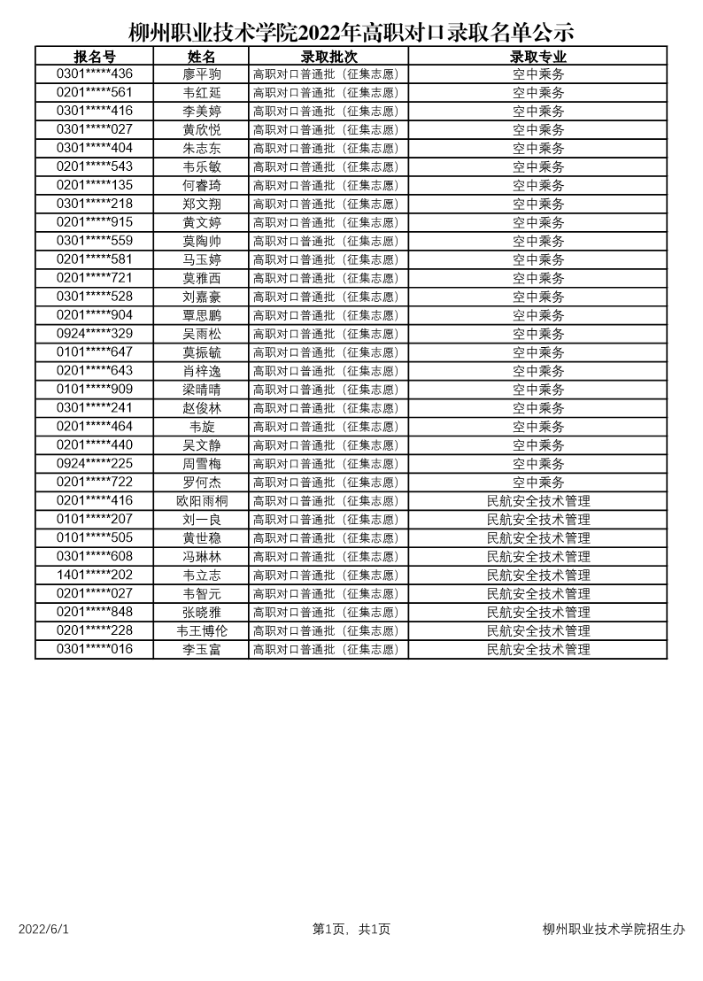 柳州职业技术学院2022年高职对口(征集志愿)录取名单公示
