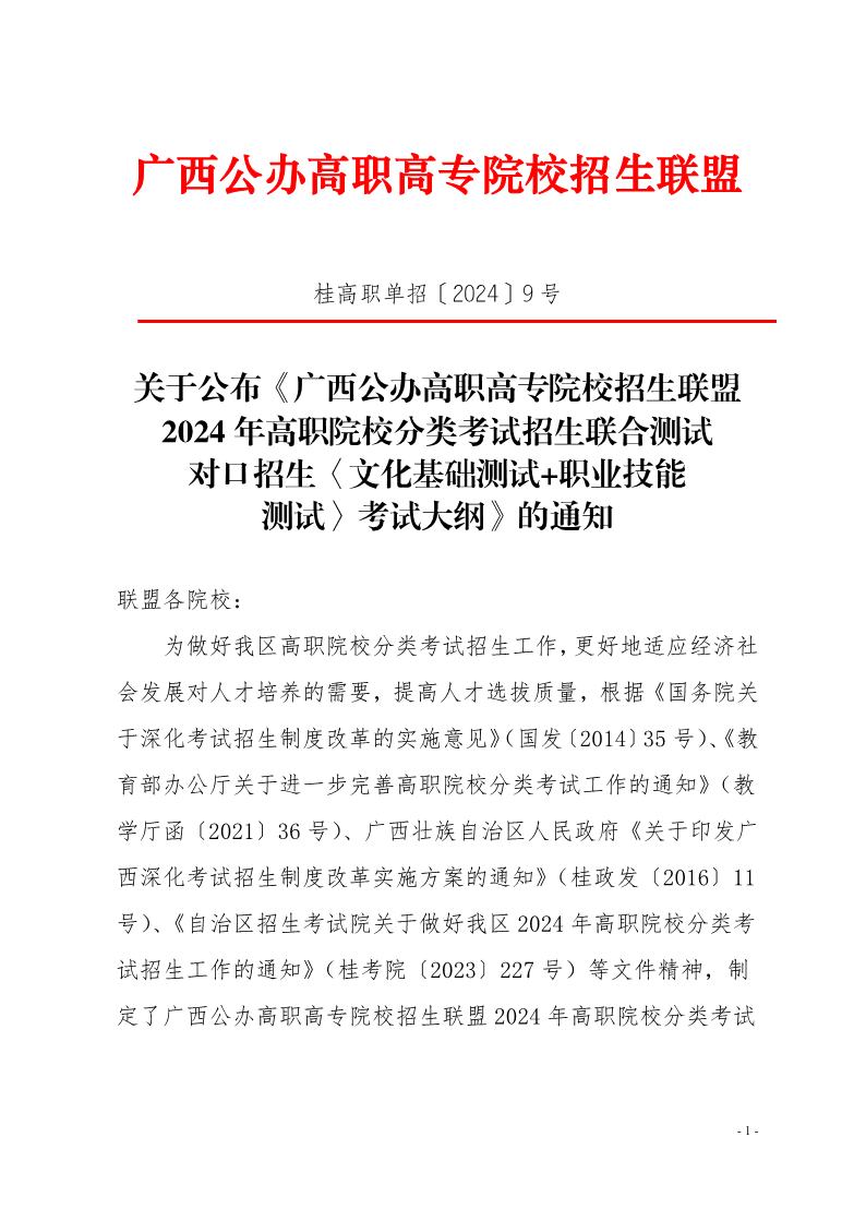 桂高职单招〔2024〕9号-关于公布《广西公办高职高专院校招生联盟2024年高职院校分类考试招生联合测试对口招生〈文化基础测试+职业技能测试〉考试大纲》的通知 来源:招生就业处 发布时间:2024-02-22 15:35:35 浏览次数: 次 【字体:小 大】 终审:招生信息中心 分享到: 【打印正文】