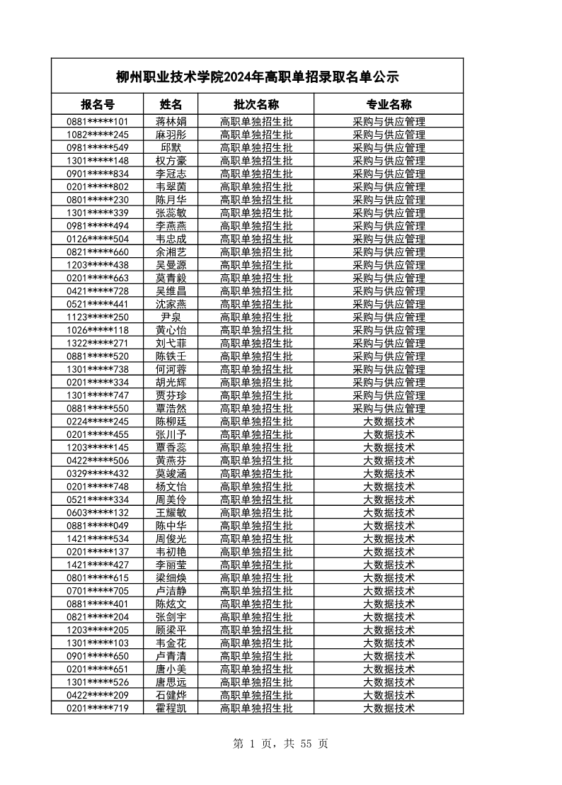 根据《自治区招生考试院关于做好我区2024年高职院校分类考试招生工作的通知》(桂考院〔2023〕227号)及《柳州职业技术学院2024年招生章程》(柳职院字〔2024〕7 号)等文件要求,我校2024年高职单招录取名单已通过广西招生考试院审核,名单予以公示(名单附后)。