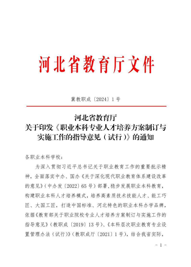 河北省教育厅关于印发《职业本科专业人才培养方案制订与实施工作的指导意见(试行)》的通知