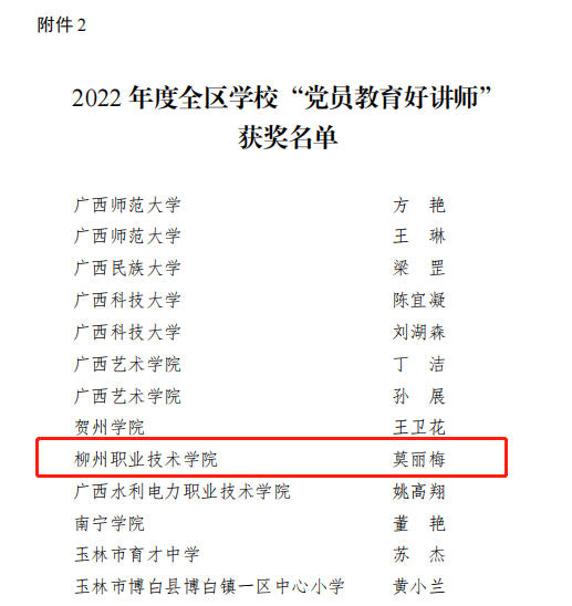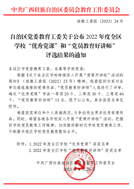 新闻网消息(文、图/党委组织部 骆琴 )2023年4月26日,自治区党委教育工委下发《关于公布2022年度全区学?!坝判愕晨巍焙汀暗吃苯逃媒彩Α逼姥〗峁耐ㄖ罚倚D雒防鲜Φ亩痰晨巍豆阄髅追劾锏摹巴沤崆椤薄沃谢褡骞餐逡馐兜纳导坊?022年度全区学?!坝判愕晨巍币坏冉?,莫丽梅老师获“党员教育好讲师”称号(全区仅13名);冯新宇老师的长党课《伟大时代的历史跨越》获2022年度全区学?!坝判愕晨巍比冉?。
