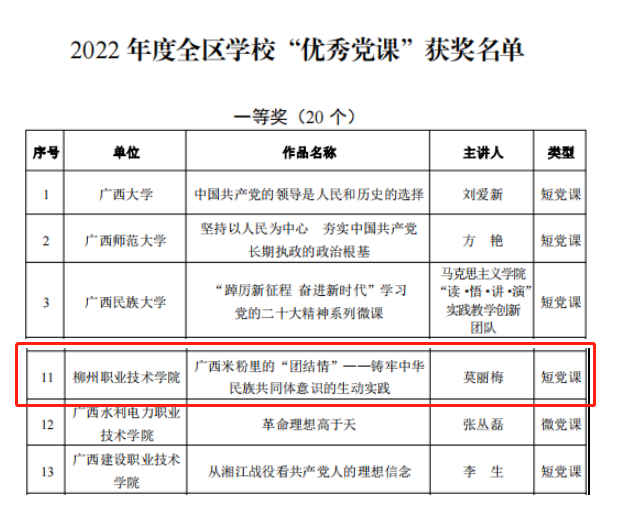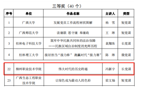 按照《自治区党委教育工委关于在全区学校持续深入开展“党课开讲啦”活动的通知》要求,我校聚焦“喜迎二十大,建功新时代”主题,组织各基层党组织持续深入开展“党课开讲啦”活动,2022年共计开展177场活动,参与人次达3000多人次,覆盖全部基层党组织。同时,广泛组织基层党组织书记、先锋模范、身边榜样讲党课,开展校级“党课开讲啦”评比活动,共评选出校级“优秀党课”12门,“党员教育好讲师”12名。“党课开讲啦”活动将习近平新时代中国特色社会主义思想作为核心内容,用生活的语言、身边的故事阐述深刻的理论,注重挖掘柳州本地资源,讲活党的创新理论,引导广大党员干部感悟思想伟力、汲取奋进力量,增强了党课的吸引力和实效性,成为落实党员教育管理基本制度、提升基层党建工作质量的有力抓手。
