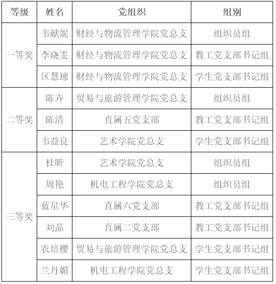 新闻网消息(文/党委组织部 李幸 图/党委宣传部 陈晨)为深入学习贯彻习近平新时代中国特色社会主义思想和党的二十大精神,扎实推动全校党务工作者“学习党务知识、增强党务本领、提高党建水平”,从而破解基层党建工作难题,引领带动基层党建工作取得突出成效,2023年5月25日,我校2023年党务工作者基本功大赛在官塘校区匠心书院初心区和慧心区顺利举办。比赛分为专职组织员组、教工党支部书记组、学生党支部书记组三个组别。来自校内各基层党支部(直属党支部)的书记/副书记、专职组织员共计27名选手参加角逐,大赛共评出3个一等奖、3个二等奖、6个三等奖。其中,财经与物流管理学院党总支部韦献妮、李晓雯、区慧琼3名选手包揽三个组别一等奖。